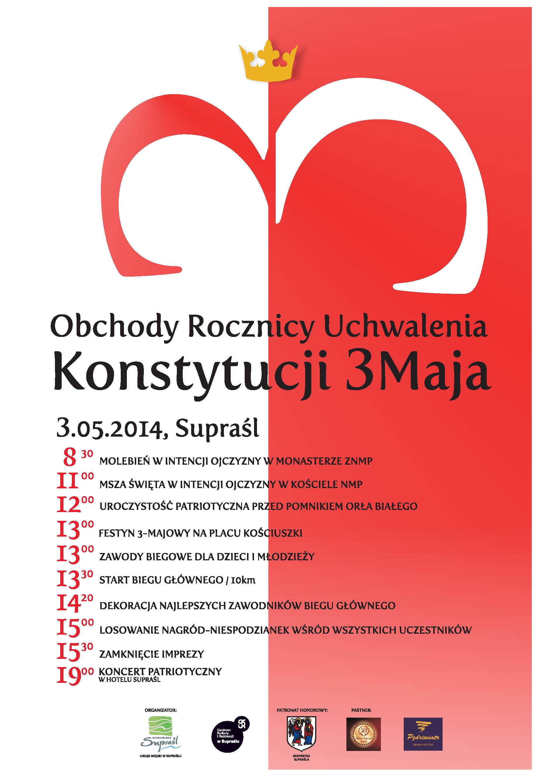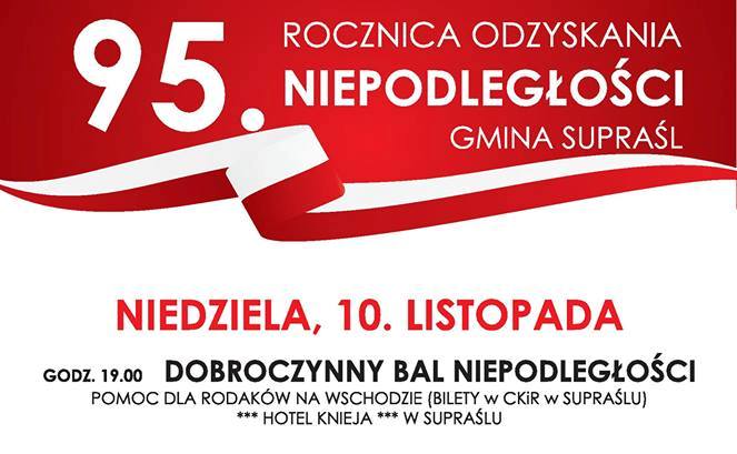 W przeddzień Święta Niepodległości organizowany jest w Supraślu Dobroczynny Bal Niepodległości, z którego dochód zostanie przeznaczony na pomoc dla naszych Rodaków na Wschodzie. Bal odbędzie się w Hotelu KNIEJA w Supraślu w niedzielę - 10.11.2013r. o godz. 19.00. Impreza będzie odbywać się przy towarzyszeniu tylko polskiej muzyki. Koszt uczestnictwa wynosi 100 zł od osoby. Bilety na bal można nabyć m.in. w Centrum Kultury i Rekreacji w Supraślu oraz w obu supraskich parafiach.