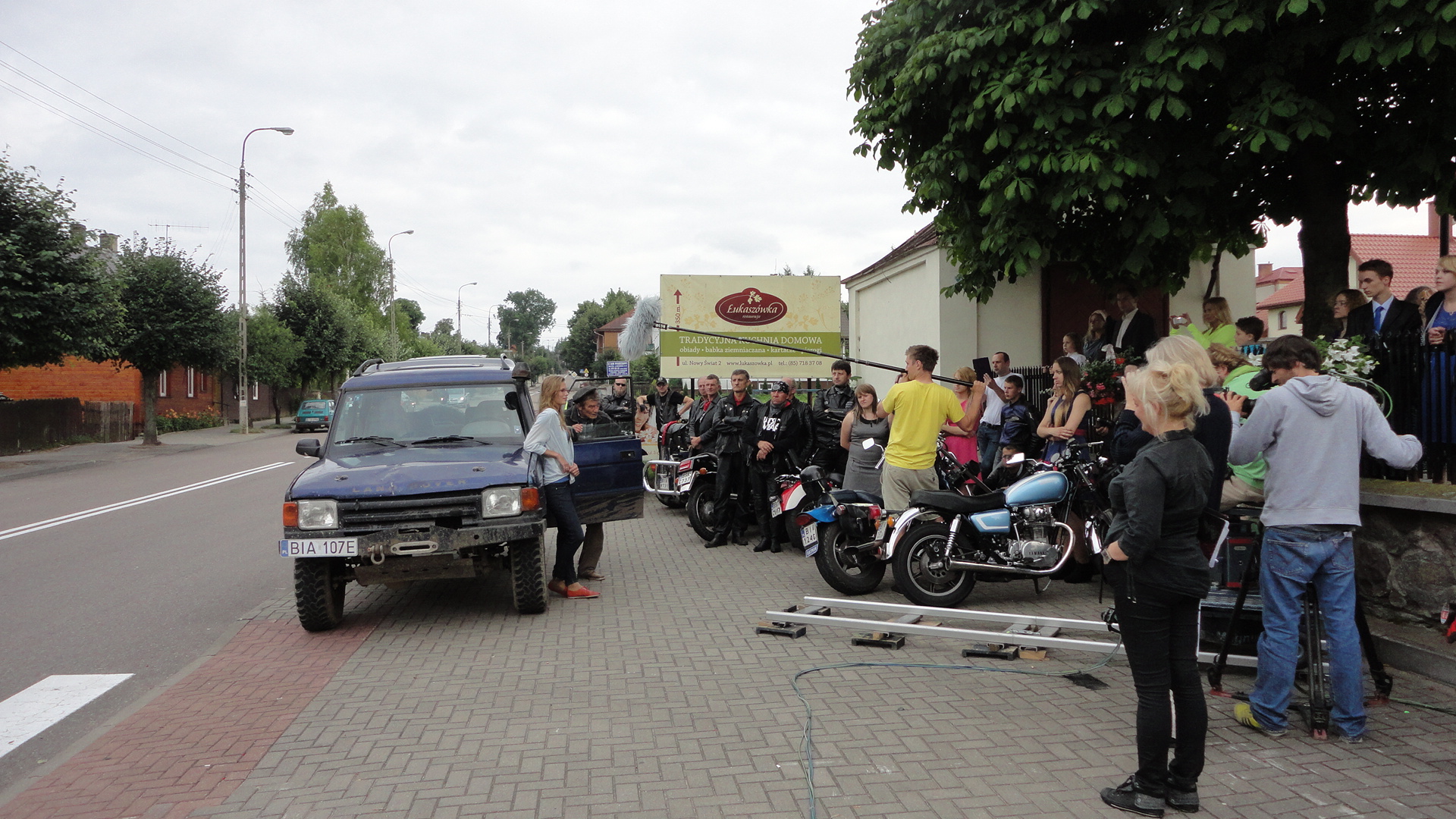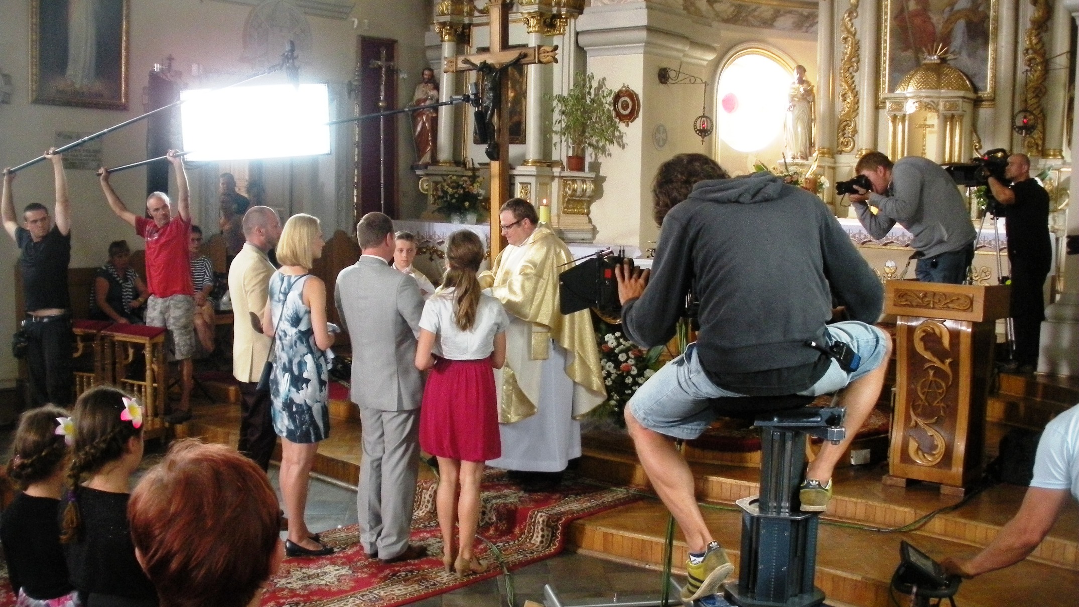 Filmowana scena rozmowy pod kościołem bohaterki serialu - weterynarz Sylwii (Julia Pietrucha) z Pula-Hula (Krzysztof Kiersznowski)