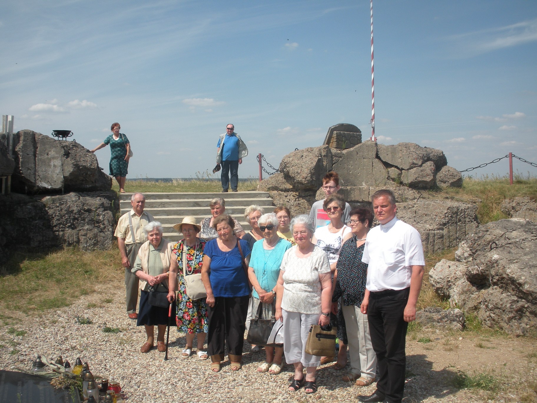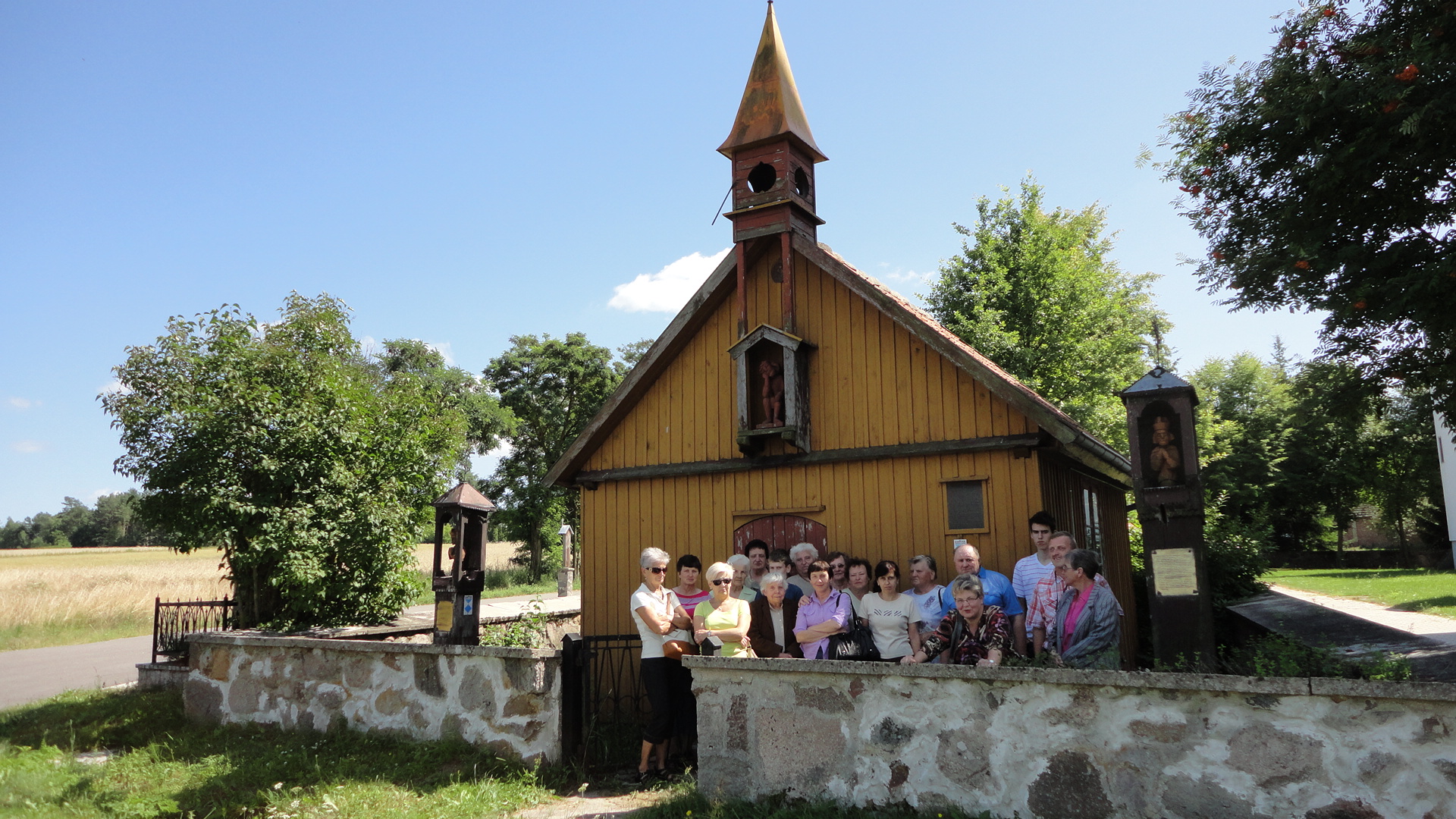 Uczestnicy wycieczki przed zabytkowymi XIX-wiecznymi kaplicami w Pogorzałkach