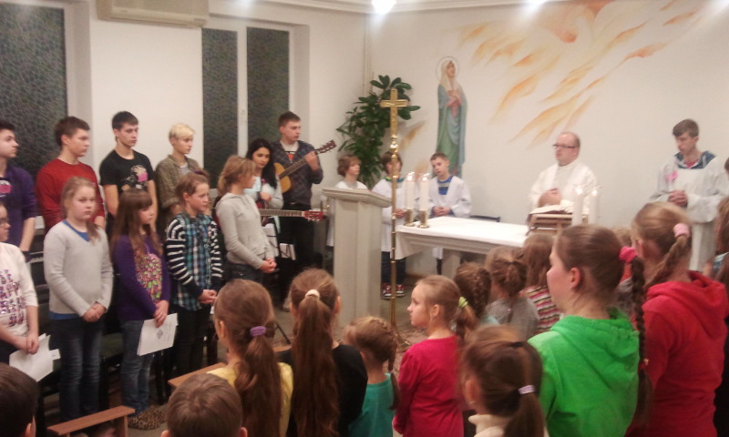 Przez okres Adwentu ponad 20 grupa dzieci z naszej parafii codziennie o godz. 17.30 gromadziło się w kościele, aby wspólnie przygotowywać się na przyjście Pana Jezusa. Tegoroczne adwentowe nabożeństwa roratnie dla dzieci przeżywane były pod hasłem „Uboga droga”. Ta zaproponowanych przez redakcję „Małego Gościa Niedzielnego” forma nabożeństwa, miała na celu uczeniu umiejętności dzielenia się z innymi dobrem, by w ten sposób zaskarbiać dary w niebie. Mali uczestnicy Rorat codziennie poznawali świętych, którzy swoje życie w sposób szczególny poświęcili służbie drugiemu człowiekowi. Dzieci przynosiły zaoszczędzone monety groszowe o różnym nominale, ofiarowane na cel leczenia małego Mateusza (bliższe szczegóły o Mateuszu na stronie: http://malygosc.pl/doc/1777544.Mati).